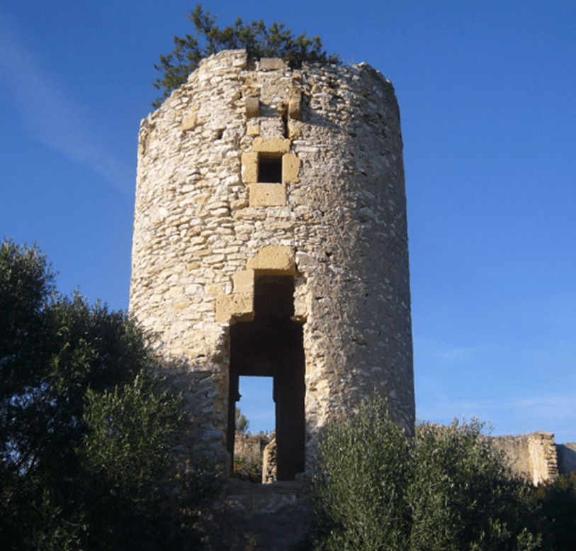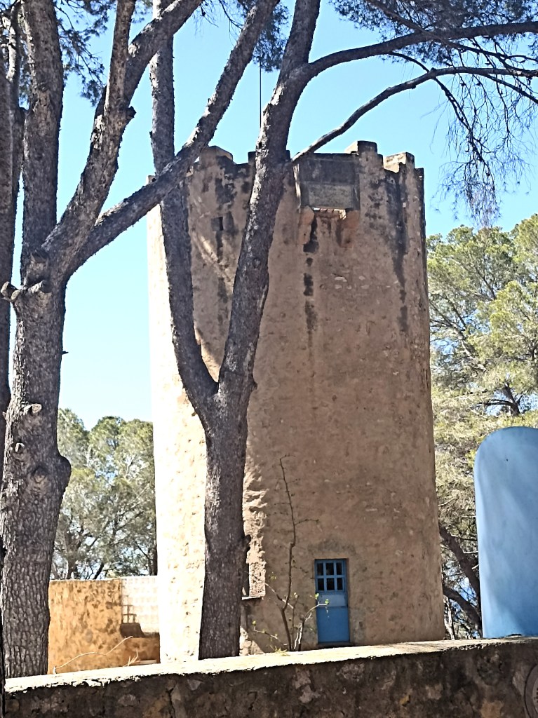 Después viro al interior al encuentro de una torre defensiva, a unos 300 m. se ubica la Torre d’en Grimau del siglo XIV, entre bancales de cultivos casi abandonados, de tierras pobres, aquí llamadas conrreos, utilizadas como huertos de gramíneas salpicadas de algarrobos y olivos. Sobresale la silueta circular de 10 metros de altura y unos tres de diámetro. Contiene tres plantas, con techos abovedados y dos puertas, una a nivel del suelo, la otra en el primer piso. Luce numerosas ventanas originales perfiladas con jambas de piedra picada.