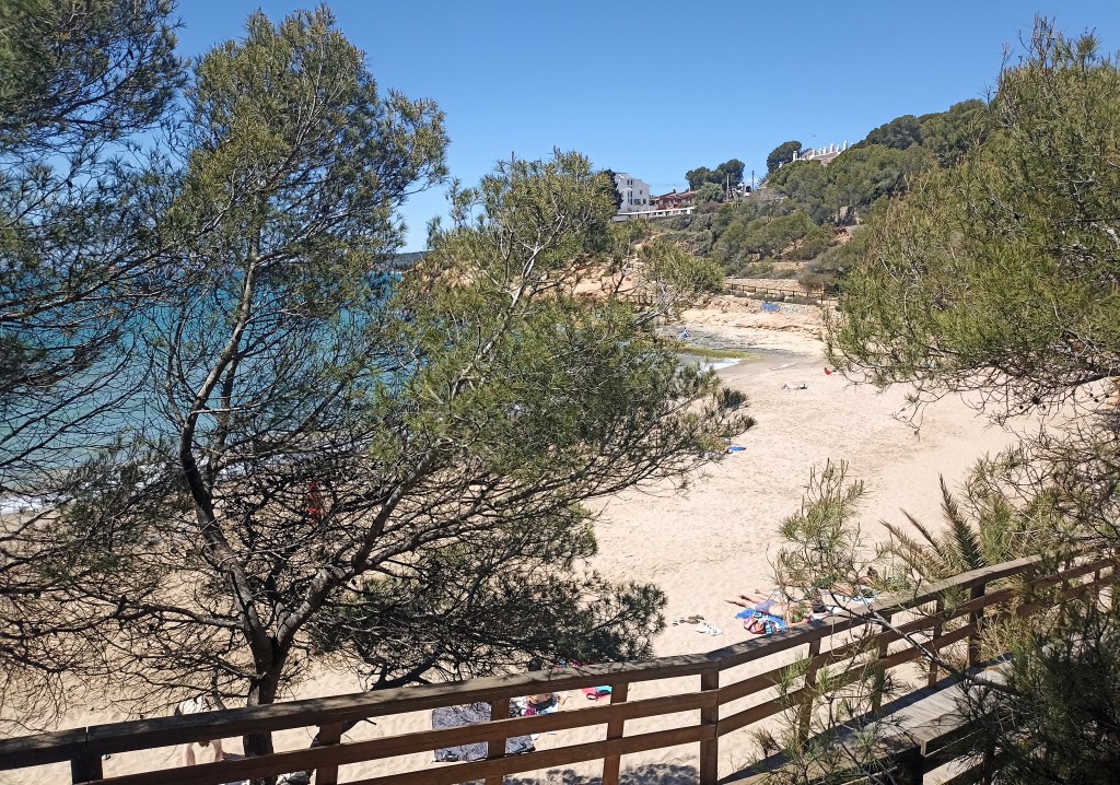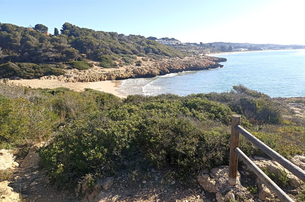 Ando a lo largo de lo que resta del antiguo camino de ronda, que transcurre junto a la vía del tren de cercanías, que mantiene su trazado costero, por un rosario de calas y roquedales. Se suceden las playitas de la Rabassada, la de Savinosa y la de Capellans, hasta abrirse el frente costero con largueza en playa Larga, casi tres kilómetros de arenal que finalizan en la Punta de la Creueta.
