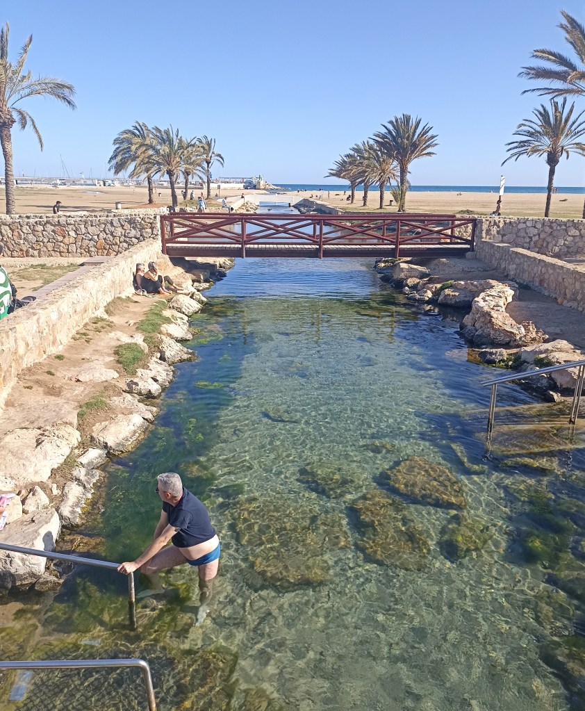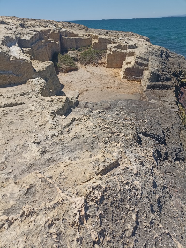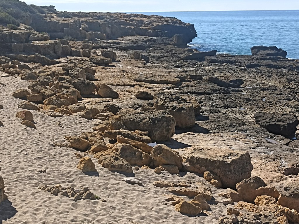 Transito evocador y añorante playa Larga para finalizar en un roquedal de acantilados de arenisca y conchas fósiles. Afloran las mermas arrancadas por una cantera romana que han formado piscinitas geométricas. Recuerdo la visita que hicimos a las canteras del Medol, muy cerca de aquí, con su aguja testigo que permitía comprobar la profundidad de la excavación. Fueron necesarias ingentes cantidades de sillares para levantar la cantidad de monumentos que exigía la Tarraco romana.