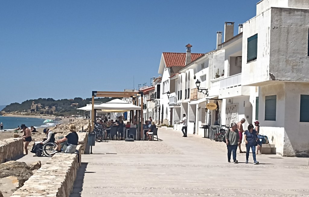 En total 2 km de playa al continuarse con la de Altafulla. Me resultan muy atractivas las fachadas de las casas de pescadores que se han conservado, un barrio marítimo, una calle apenas junto a la arena, ni siquiera supone paseo marítimo, que guarda la esencia de lo que fue no hace tanto. Detrás edificaciones vacacionales que no resultan demasiado altas, parecen aguardar para el asalto a la primera línea de playa, pero afortunadamente, se ha preservado al menos esa calle. Aleluya. Me siento en una terraza entoldada, como antiguamente, sin cartelería publicitaria ni reclamos excesivos y doy cuenta una merecida jarra de cerveza y un bocadillo.
