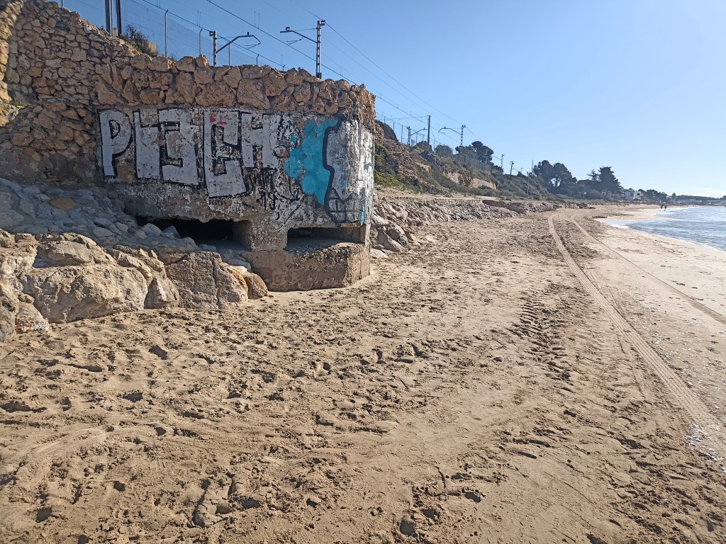 Pasada la obra del castillo desciendo a la playa de Tamarit propiamente dicha, desluce la presencia de un búnker incrustado en los bajos de la muralla, camuflado mamotreto defensivo entre las nobles instalaciones medievales. Ofrece un contraste insólito su roma silueta, medio cubierta por la arena, y la airosa estampa del castillo.