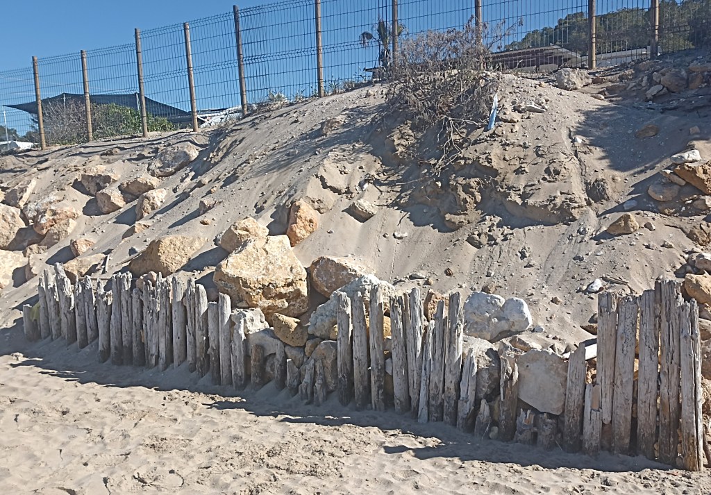 Enseguida la desembocadura del río Gayá y, a mitad de la playa, sobre los restos yacentes de lo que fueron esplendorosas dunas, buscando el firme sólido, se encarama otro búnker, este más amplio, un puesto de mando quizá.