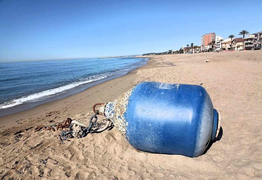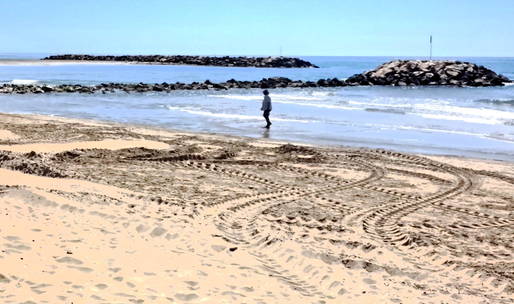 La playa se va estrechando. A partir de aquí será necesario, y de qué manera, fabricar playa. Surgirán como setas tras la lluvia, una sucesión ininterrumpida de espigones, un rosario de escolleras, a lo largo del paseo marítimo de Cunit, sin solución de continuidad, que no he visto en ningún otro punto del litoral mediterráneo, y mira que llevo recorrido trozo, casi un millar de kilómetros. Desde el aire aparecen como ráfagas de metralleta sucesivas, tal parecen tanta T T T T dibujada, pues esa es la forma que tienen, junto a la costa. Entre ellas se dibujan, se fabrican, a modo de habitaciones playeras, medias lunas de litoral arenoso, con una curiosa amígdala sujetas a la playa como isletas. Será así hasta el final de la etapa, y aún mañana, en la playa de Sitges. Es lo que tiene vender sol y playa, que donde ha mengua, hay que recuperarla como sea.