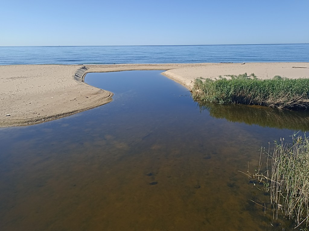 Cruzo el torrente de Pedro y San Antoni, en Les Sabines, playa de les Gavines, habitualmente seco por su estacionalidad. Este reguero marca el límite provincial entre Tarragona y Barcelona. Al finalizar esta última provincia, en el rio Tordera, junto a Blanes, me quedará únicamente transitar la provincia de Gerona. Habrán sido ocho en total y cuatro comunidades autónomas, todas las que baña el mediterráneo: Andalucía, Murcia, Comunidad Valenciana y Cataluña. ¡En fin, todo se andará!