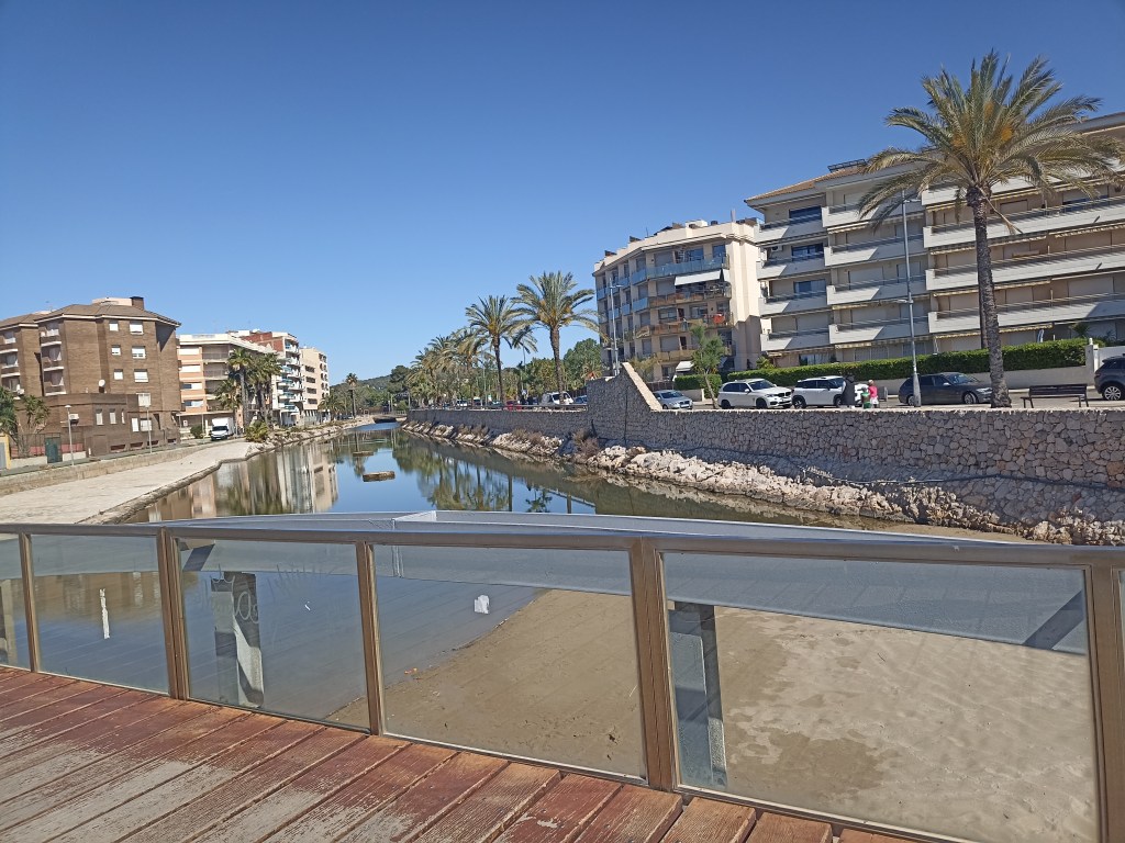 Un poco más adelante desemboca inerte, extenuada, como un reguerillo residual entre la arena de la playa la riera de La Bisbal o Rasa de Manver que procede de El Vendrell. La atravieso por un airoso puente. Suponen estos arroyos de aguas escasas, pequeños remansos de frescor, reductos donde la vida vegetal y animal intenta resguardarse, sobrevivir, esconderse de las acometidas edificatorias. Son canalillos antiguos que se preservan como zonas verdes, como ocurre en otras partes con recientes intentos por recuperar dunas playeras pretéritas, en aras de un entendido ecologismo retardado, postural. Moderneces, poses, intentos municipales por maquillar la invasión constructiva que sus predecesores alentaron (y ellos toleran todavía). Cartelería barata de sus buenos propósitos.