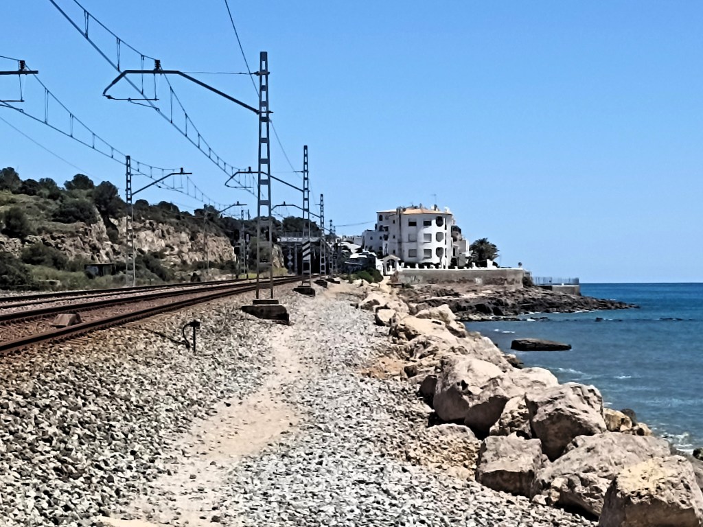 Comarca del Garraf….Playa de Cubelles, playa larga a costa de nuevas ráfagas de metralleta T T T T T, pero aquí aparece una variante, debe ser otro tipo de munición, se deforman las T, alguna parece una L, otra una Y. Hasta que se agota la balacera y entonces surge un tramo de aproximadamente medio kilómetro donde desaparece la playa artificial, llegando el mar hasta el terraplén de la vía del tren. Apenas unos pedruscos gordos diseminados logran contenerlo y trazar un escueto paso, una senda punteada de grava gorda, la que asienta las traviesas, que me lleva hasta la Punta del Sant Gervasi, también llamado el Racó de Santa Lucía. Aunque es la patrona de los ciegos, es preciso tener los ojos bien abiertos para saborear este excepcional paraje: un roquedo prominente, en medio de tanto arenal, ocupado por una urbanización de estilo ibicenco que no desentona. Hasta una piscina sobre el mismo borde el agua tiene, y permite el libre paso de peatones y bicicletas.