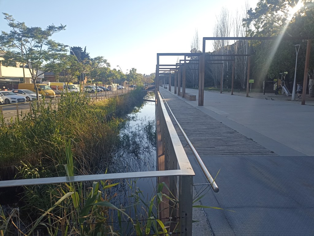 Abandonado el núcleo originario, el punto fundacional de la villa, paseo por la población. Atravieso el trazado de la vía del tren y me encuentro enseguida, de camino a la playa, con la rambla de Mar-i-sol y el estanque de l´Olla del Rey. Existió en la zona, como ya he explicado, una gran profusión de aguas, por debajo del nivel del mar, restos del antiguo y extenso delta del río Llobregat, actualmente canalizado. Ello permitió excavar un Canal Olímpico, de 1.200 x 120 m., con 3,5 de profundidad, y curiosamente de fondo poroso para intercambio aguas con la capa freática, con motivo de las olimpiadas de Barcelona de 1992, que se encuentra en las inmediaciones. Al hacerlo se descubrió un pecio, una barca medieval de 10 m. de eslora que quedó embarrada en las antiguas lagunas; se extrajo y restauró, está expuesta en el Museo Marítimo de Barcelona. Todo ello da una idea de hasta qué punto se encontraba la zona anegada.