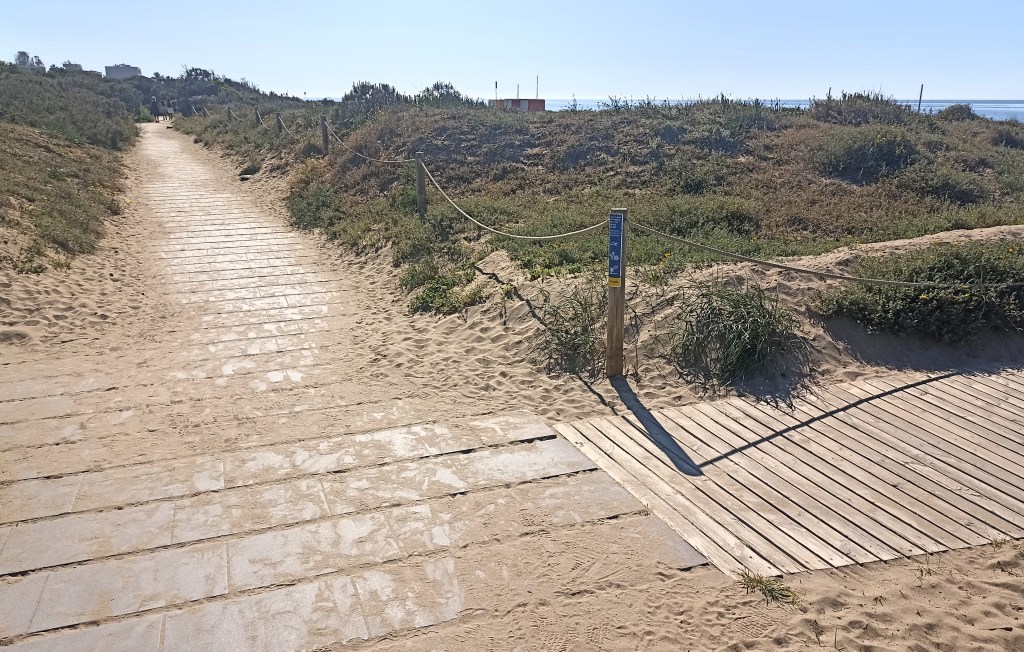 Salgo a la playa, es amplia, larga y ancha, un considerable arenal algo destartalado, ocupado en parte por una especie de reserva biológica, como ocurre en otras playas que he visto con anterioridad: un trozo acotado con cuerdas donde se busca recuperar especies vegetales autóctonas e ir conformando, más o menos, el aspecto primigenio que una vez, antes del masivo asalto turístico, tuvo.