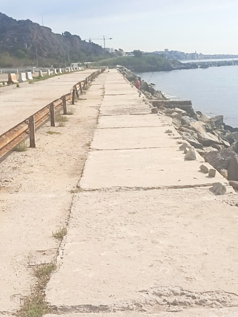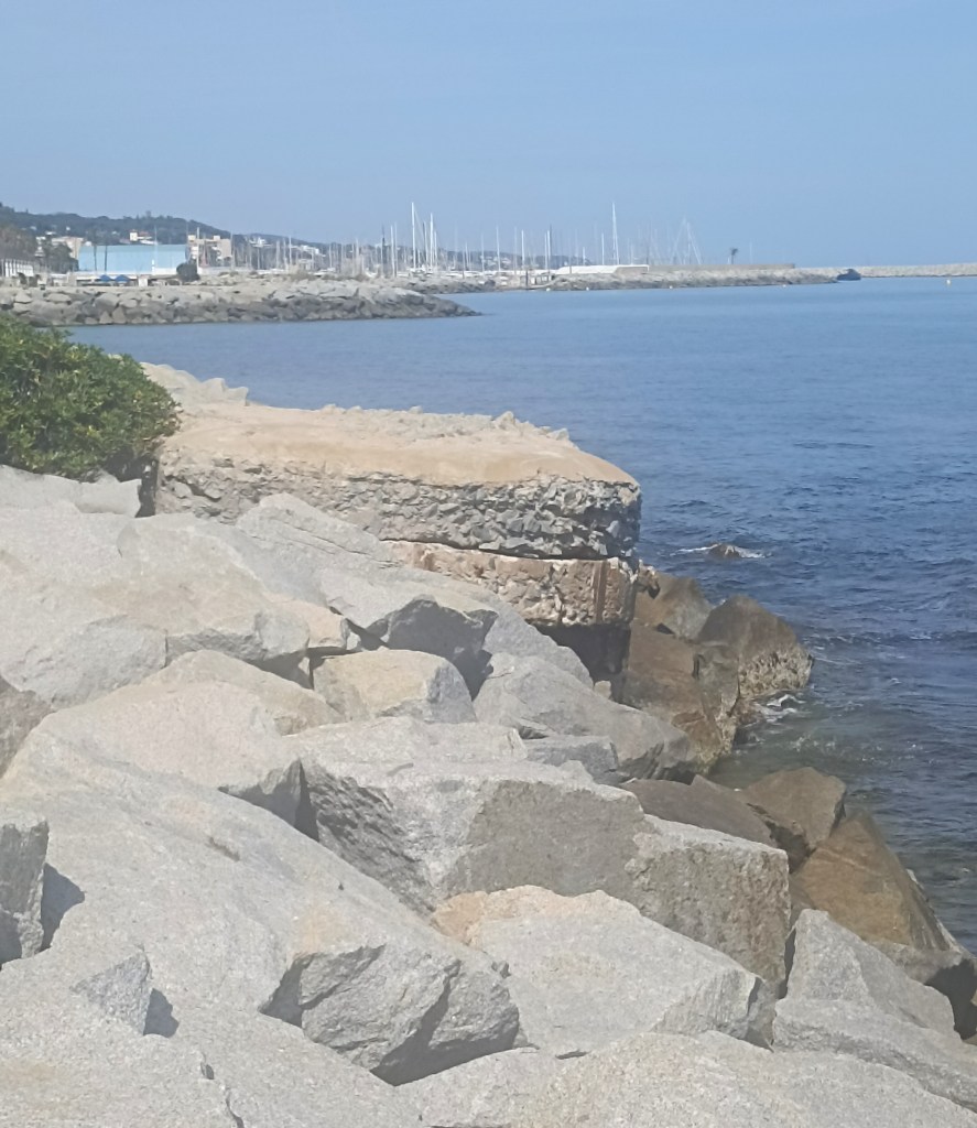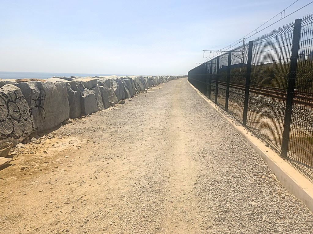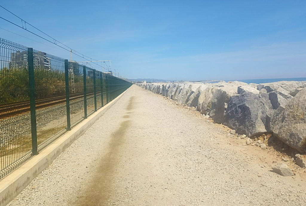 Continuo junto a la vía del tren por una acera que transcurre a lo largo de una estrecha franja de tierra robada al mar. Tan estrecha que se hace necesario contenerlo con grandes pedruscos, como si de un espigón horizontal, sobre la misma playa, se tratara; en vez de los habituales que avanzan en el agua. Le llaman paseo marítimo de Montgat, por llamarle algo, y hasta tiene una pizca de arena habitable, playa de los Toldos, de arena gruesa, basta. Transcurre hasta el puerto deportivo del Masnou, donde lo prominente de su edificación sobresaliendo dibuja una anchura de arenal algo más convincente.