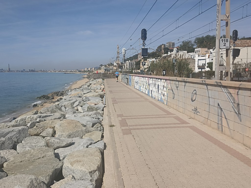 Estoy llegando a Mataró. He seguido el mismo trazado que dibujaba la primera vía férrea que se construyó en España, la línea que unía Barcelona y Mataró en unos 29 km, inaugurada en octubre de 1848. Todavía permanece en uso. Puedo corroborarlo, de hecho la he llevado al lado todo el día, mi izquierda .