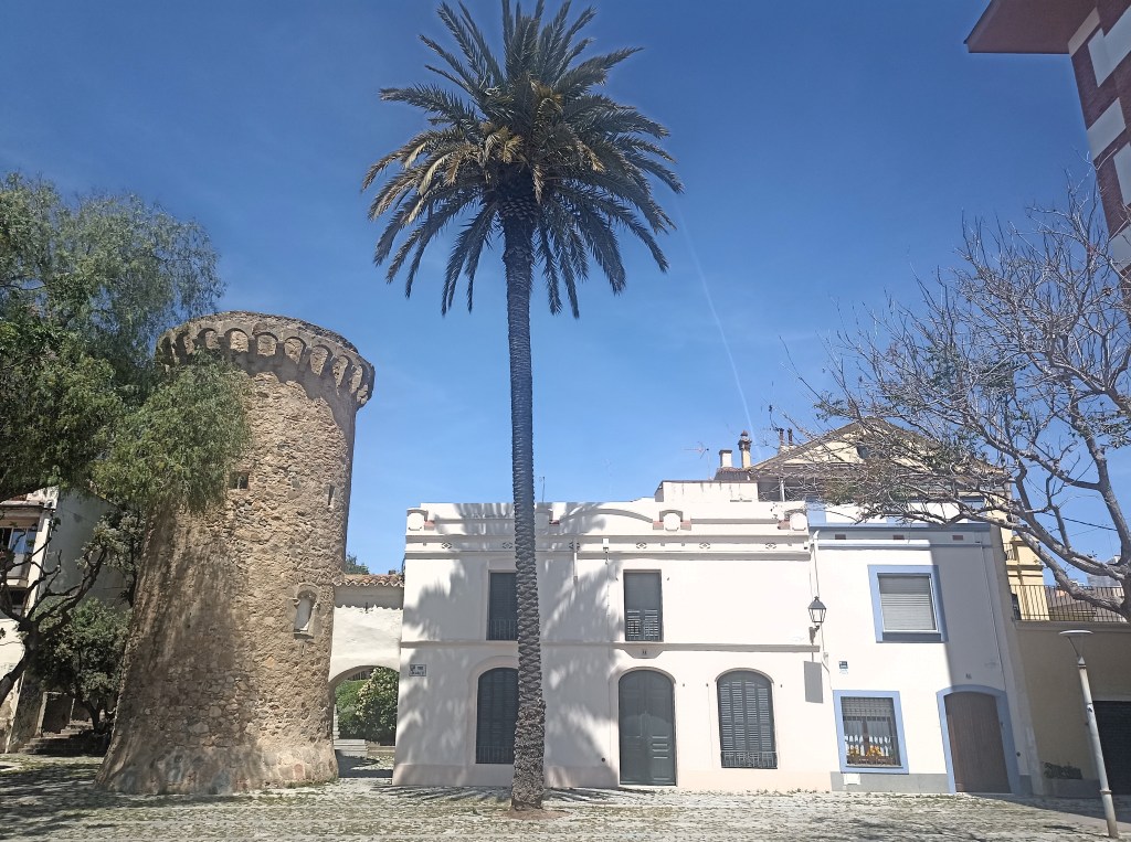 Si citase, además, las torres de la red de telegrafía óptica, para uso militar, mayormente, -a las que he aludido en otras etapas- esa desmesura derivaría en locura. Por cierto que en Vilassar queda una de ellas, esquinera, entre casas antiguas en la calle Doctor Masriera, bien chula, por cierto, la número 51 del ramal Barcelona-La Junquera. Muy cerca de ella localizo en paseo marítimo la siguiente torre a visitar, la torre d’en Nadal. Pero opto primero por comer, ya va siendo hora. He descubierto aquí cerca, en la misma fachada marítima, una casona. Menos ostentosa y rimbombante que las anteriores, se utiliza como Centro Cívico para reuniones vecinales, cursos y actividades varias; pero en su planta baja y su jardín delantero con terraza se ubica un restaurante. Tiene entrada por la callejuela trasera, que es por donde accedo. Doy cuenta de unas estupendas alcachofas gratinadas -es uno de los preceptos de mi religión: alcachofas siempre que haya- y un pescado. Buena cocinera y platos diferentes, originales, precio ajustado del menú y ambiente tranquilo, ¿qué más puedo pedir? Este pequeño estipendio supone un lujo, que valoro, enmedio de tantas jornadas bocadilleras.