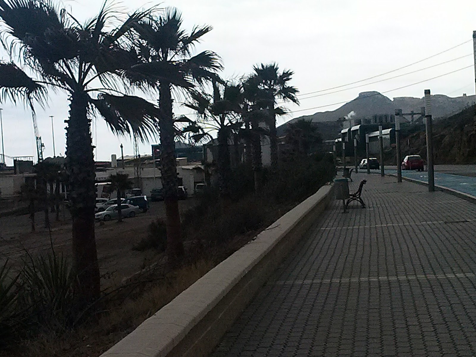 Vuelvo a la carretera, por un carril que corre junto a ella alcanzo el aparcamiento municipal habilitado para los usuarios de la playa de los Muertos, extensa y casi virgen, verdadero litoral de Carboneras, preferible al escueto arenal de que dispone el pueblo. Comienzo el descenso por el arcén de la carretera, no hay otra opción, agarrado a los quitamiedos a trechos, dejando al lado un barranco. Nada más terminar la cuesta, coincidiendo con el final del Parque Natural, que se interrumpe aquí para retomarse al final de la playa de El Algarrobico, comienza una enorme recta de varios kilómetros, una desmesurada pasarela industrial sobre la que se suceden diferentes modelos –nada escuálidos precisamente- de macrofábrica: una cementera (Holcim España SA), una refinería de petróleo(FJ Sánchez Sucesores SA), una desaladora de Acuamed, una central térmica (Endesa), seguidas -no podía ser de otra manera- del Tanatorio Municipal; con los correspondientes puertos, tres en total. Más que una bofetada en la mandíbula supone una patada en los…de mi afinado sentido estético.