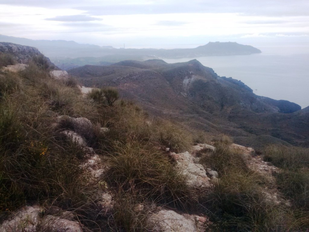 Entiendo que camino sobre el lomo de un colosal animal echado, una criatura colosal, el espinazo de la tierra; entre la pilosidad vegetal de los espartos reverdecidos transcurre una senda, ahora apenas insinuada por el escaso trasiego que recibe, que me adentra a fondo en estas inmensidades desiertas. Una larga pasarela se prolonga sobre altos cerros enlazados, dejando a un lado el mar oscurecido de profundidad, amurallado de riscos; al otro lado una sucesión de pequeñas elevaciones que se ondulan cosquilleando la mirada hasta donde la vista alcanza, sin asomo de que se vislumbre fábrica humana alguna. No se distinguen vestigios artificiales, construcciones, carreteras, ni siquiera el tendido eléctrico se atreve a contaminar esta visión, no se presentan impedimentos ni estorbos a mi libre conversación con la tierra.