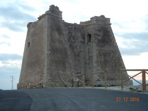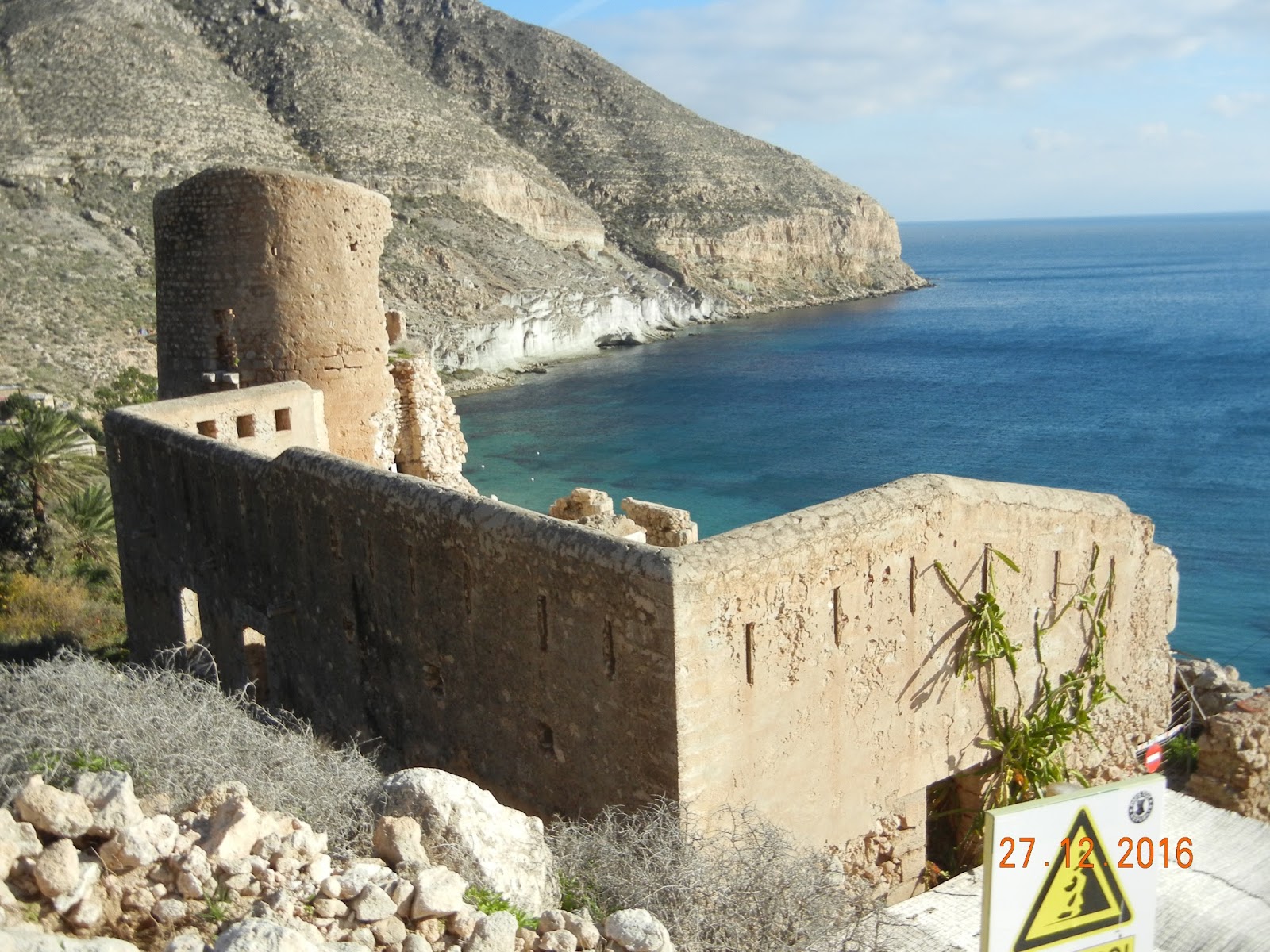 A la derecha, el esbelto castillo-batería de tiempos de Carlos III en planta de pezuña de buey levantado en 1776, con la cornisa-parapeto y la techumbre muy estropeadas, en estado interno ruinoso por las voladuras de la cantera (lo cual no es óbice para que aparezca en varios capítulos de la serie Juego de Tronos). Ocupa el lugar de una primera torre vigía mandada levantar a finales del IX por Abd el Rahman II para defender la costa de los ataques vikingos.