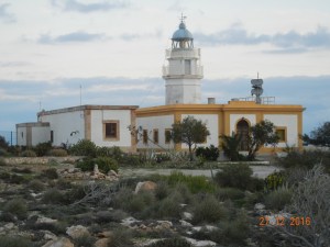 A la izquierda, mirando al mar, se sitúa el faro, una construcción de 1863 escueta pero preciosa, con un alcance de 23 millas náuticas. No me resisto a trasladar de la crónica de Francisco Hernández Benzal (Carboneras, Un recorrido por su historia), del capítulo de temporales marítimos y nieblas, un episodio muy destacado por lo inverosímil. Cuenta el farero Simón Fuentes:” Durante toda la noche del 2 de febrero de 1934 los cristales de la linterna que daban a la parte norte han estado cubiertos de nieve y aunque a intervalos y con exposición de la vida hemos procurado baldearla de la cornisa y de los cristales, no deja de haber sido un gran inconveniente para los efectos de los navegantes, por la magnitud del sector que ha estado sin alumbrar”.