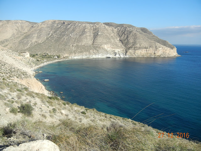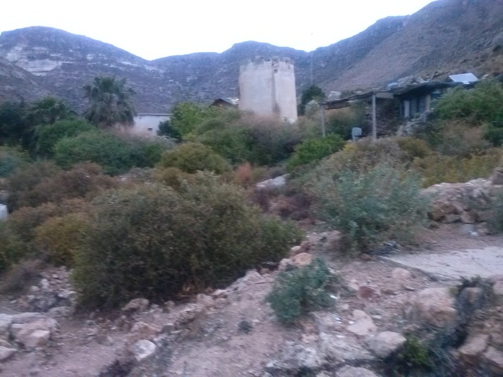 Las vistas son tremendas, alcanzo a apreciar casi desdibujados, emergiendo de las últimas brumas del atardecer, los Dos Frailes orando a estas horas su rezo de completas; la Punta de la Polagra con su torre de Lobos encima; los entrantes que corresponden a la cala del Plomo, a Agua Amarga. Al otro lado, hacia el norte, Carboneras a mis pies, la torre de Endesa presidiendo (sus doscientos cuarenta metros la ponen, sin embargo, a mi altura), señalizada con cuatro anillos de luces rojas que la adornan y le confieren el aspecto de un grotesco y minimalista árbol de navidad; la torre del Rayo un poco más allá y tras ella, sobresaliendo un poco entre montañas, asoma de puntillas avergonzada y blanquecina la impertinente mole del hotel Algarrobico sobre fondo de la sierra de Cabrera. Hacia el interior, tras los manchones violáceos de sierrecillas menores oscurecidas, veo insinuarse unas nieves lejanas en las cumbres de Sierra Nevada.