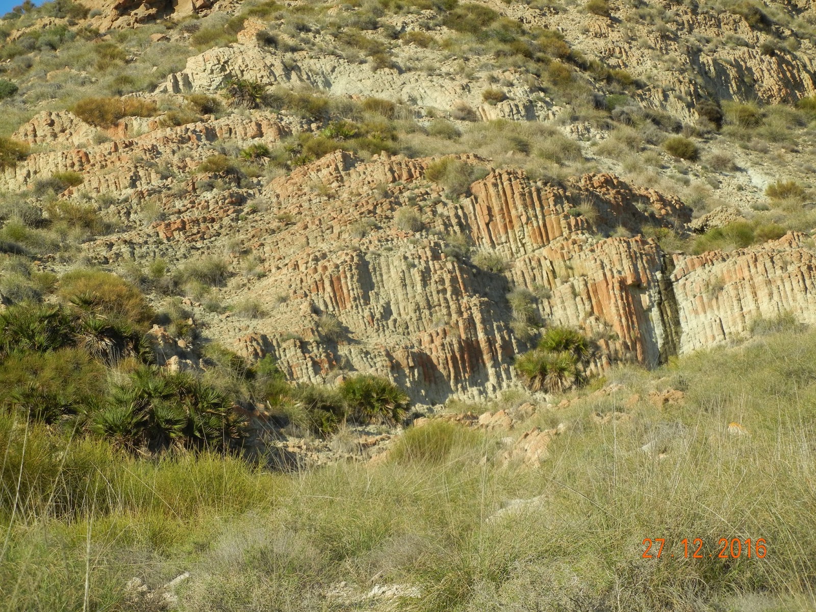 Aparece como una impresionante parapeto, una atalaya natural de grandes proporciones que se alza más de ciento cincuenta metros desde la carretera. En realidad es un arrecife coralino fosilizado formado en el interior de un domo volcánico. Solo puedo compararlo con el asentamiento del castillo de las Peñas de San Pedro, en Albacete, aunque de menores proporciones. Se accede a la cumbre por una carretera asfaltada en buen estado que penetra a la plataforma superior entre dos grandes peñascos. Entenderé después que fue construido para acceder a una cantera de piedra caliza inmensa que ocupa casi por completo el altiplano, sobrepasa los dos cientos metros de diámetro, debió proveer las múltiples construcciones mineras de Agua Amarga y permitió levantar los tres puertos de Carboneras.
