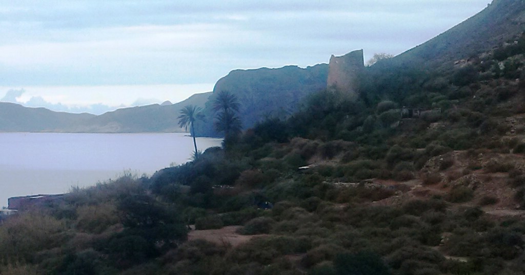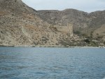 Remonto la cuesta por un carril ancho para vehículos que las lluvias han arañado y zanjado peligrosamente, hasta perder de vista el pueblo. Transcurre por el interior durante unos tres kilómetros hasta un ensanchamiento, a modo de aparcamiento, donde aguardan algunos coches, todoterreno mayormente. Prosigue una senda estrecha que baja agarrándose sin peligro a la pared de los cortados y desemboca en el mismo castillo, en el lado sur de la cala. Se aprecia, por lo oscuro de las aguas, que existe un calado profundo, muy valorado desde antiguo como puerto natural; unido al resguardo de vientos de poniente y de levante y a la excelente calidad del agua de una fuente que mana todo el año, hacían que la posesión de esta plaza resultase vital. Y, por tanto, el interés por dotarla de sólidas defensas estaba más que justificado.