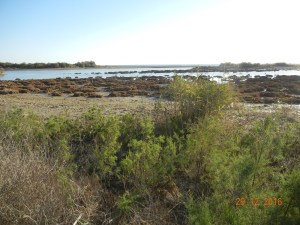 Encuentro pozas, lagunas someras de mar invadiendo las tierras bajas de la desembocadura del río Almanzora, donde el caudal resulta intermitente –un poco más arriba el embalse de Cuevas retiene el caudal- y a veces se desparrama en charcas pedregosas ribeteadas de eneas, cañas y carrizos, que ocultan patos y ánades variadas, fochas y garcetas, que a estas horas escarban al encuentro de su desayuno. A pesar del cuidado que pongo, mi paso o mi silueta les hacen levantar el vuelo alarmadas.