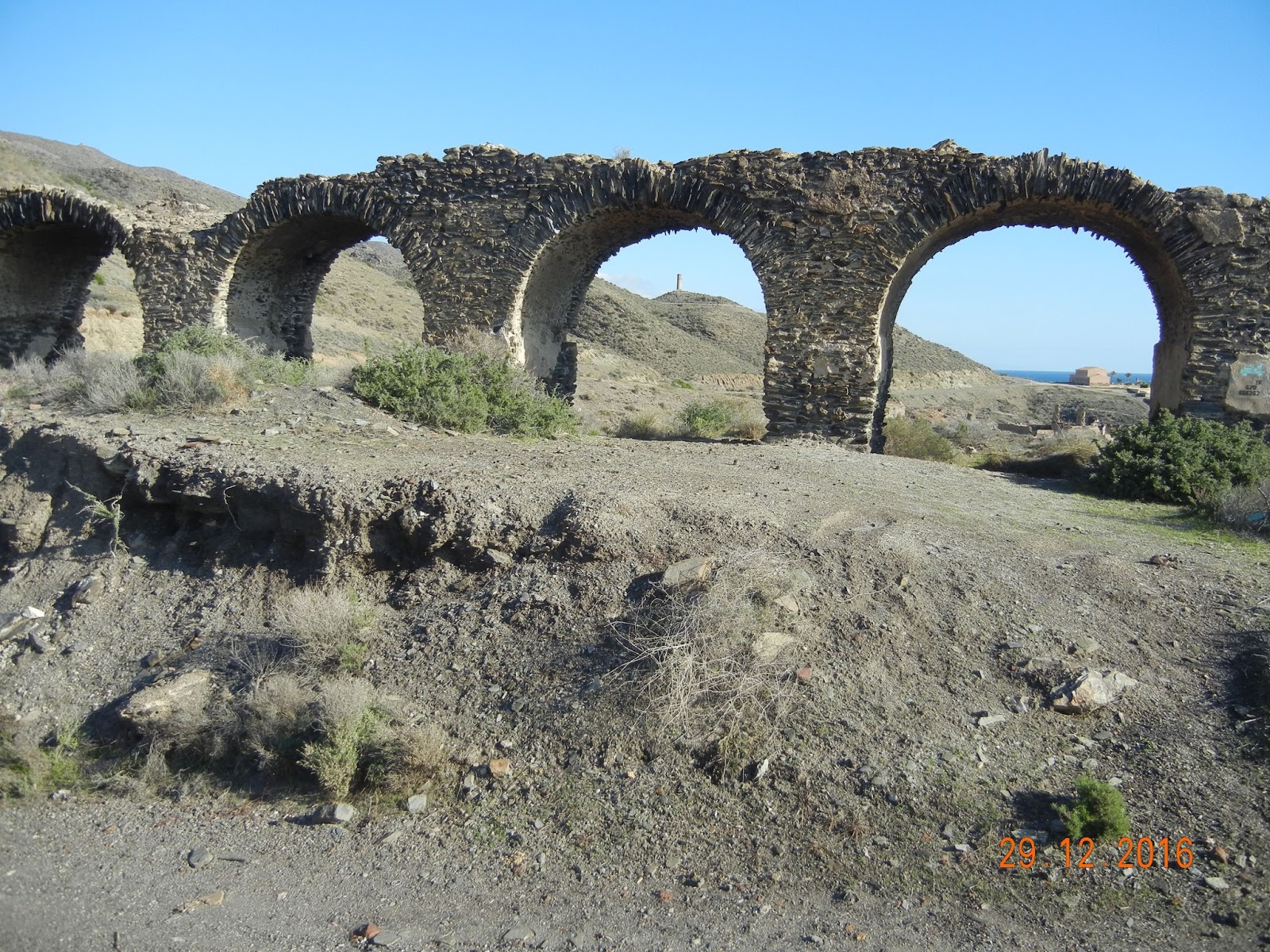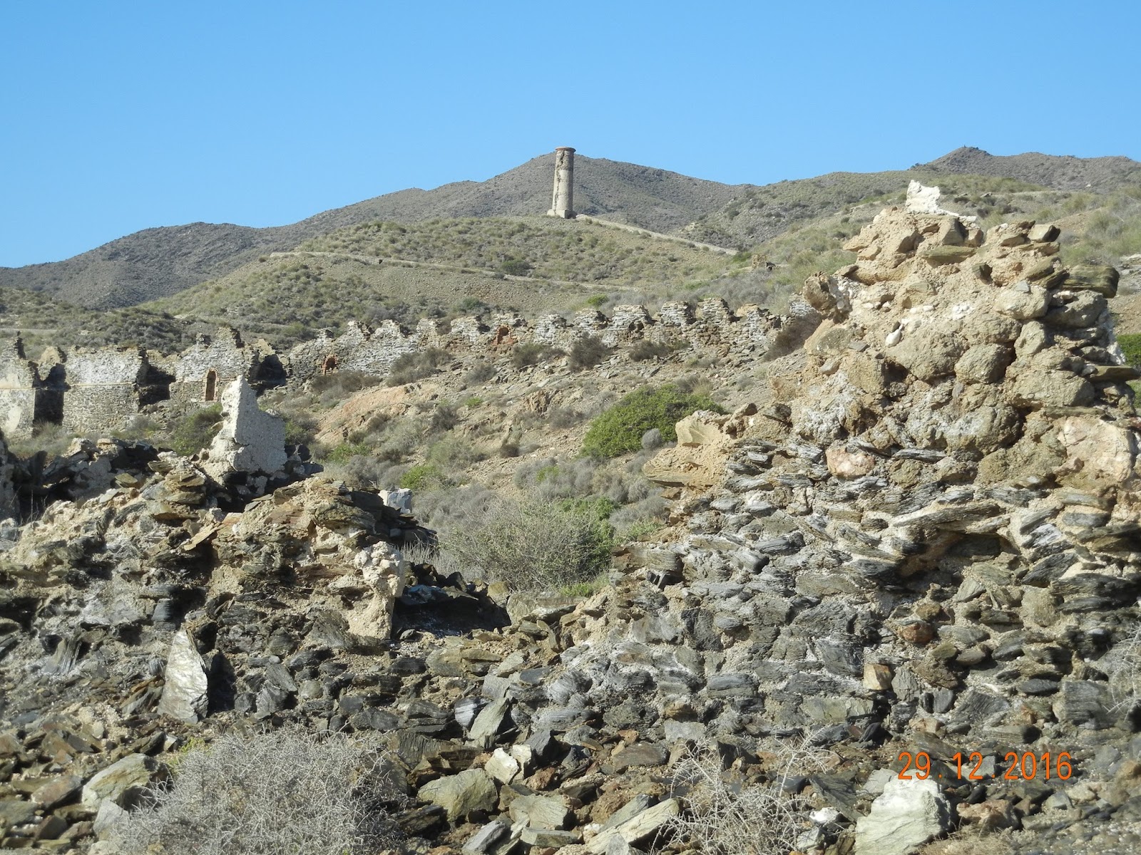 Comienza a partir de aquí un nuevo capítulo, un paisaje bien distinto a los que llevo vistos hasta ahora. Se alza delante, paralela a la costa, en estos llanos subsiguientes a la Sierra de Gata, la pequeña Sierra de la Almagrera de apenas 8 km de larga -desde Villaricos hasta el Pozo del Esparto-. Simula un felino sesteando sobre el que vemos recortarse sus vértebras. De escasa elevación, su mayor altura, el pico Tenerife, alcanza solo los 367m.; no debe confundirnos, su riqueza en minerales fue tremenda: hierro, cobre, plomo, cinc y plata. Aparecen en delgados filones bien visibles en la parte occidental, la que mira a tierra; además de calcopirita, galena argentífera, siderita, barita. Dos enclaves concretos, el barranco Jaroso (en 1838 se descubre en él un filón argentífero muy rico) y Las Herrerías, producían estos recursos entre los que sobresalía con diferencia la plata.