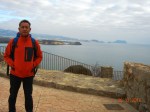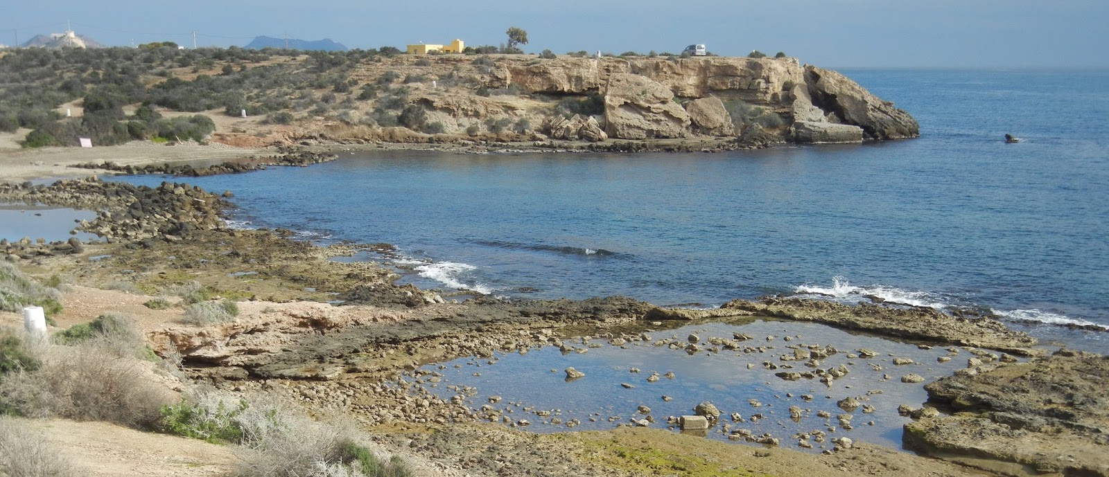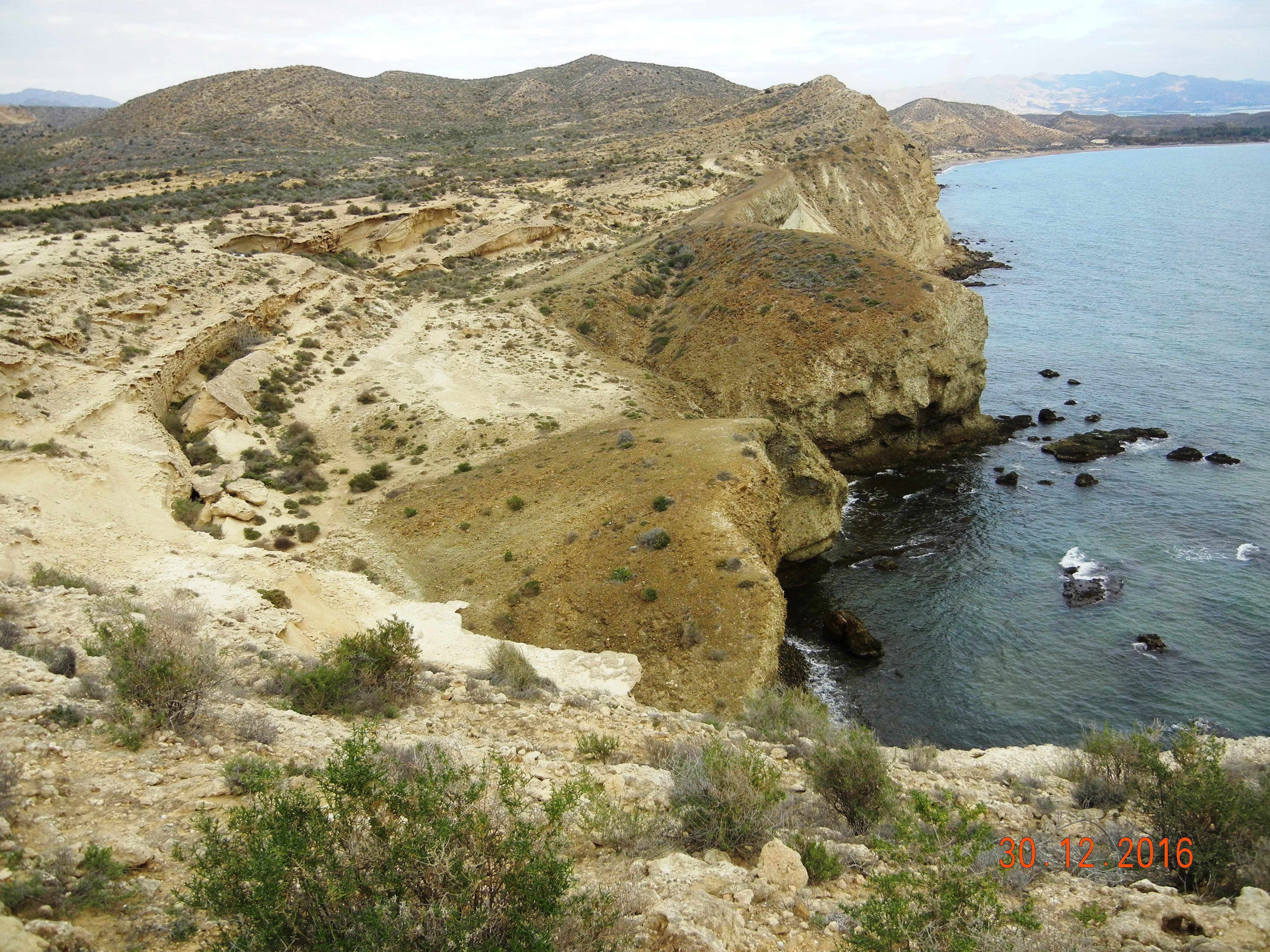 Bien, de vuelta a la andada, oteando como aplicado vigía desde el castillo, allende montes y paredones esparcidos a capricho por la naturaleza contra la línea de costa, considero la búsqueda de nuevos hitos, nuevas referencias visuales necesarias para negociar mi fatiga y estirar la mirada, que precisa desperezarse de vez en cuando. En primer término observo los morros de lasCuatro Calas; luego, casi al alcance de la mano, no por su proximidad sino por lo inmenso que parece, cabo Cope simula la silueta de un dinosaurio echado, quizá dormido, con el espinazo sobresaliendo, apetece acariciarlo o, al menos, ascenderlo y transitar su espina dorsal. La punta de La Azohía se adivina más allá cerrando el golfo de Mazarrón y con suerte si el día está despejado, no es el caso, se alcanzaría a divisar cabo Tiñoso e, incluso, cabo de Palos.
