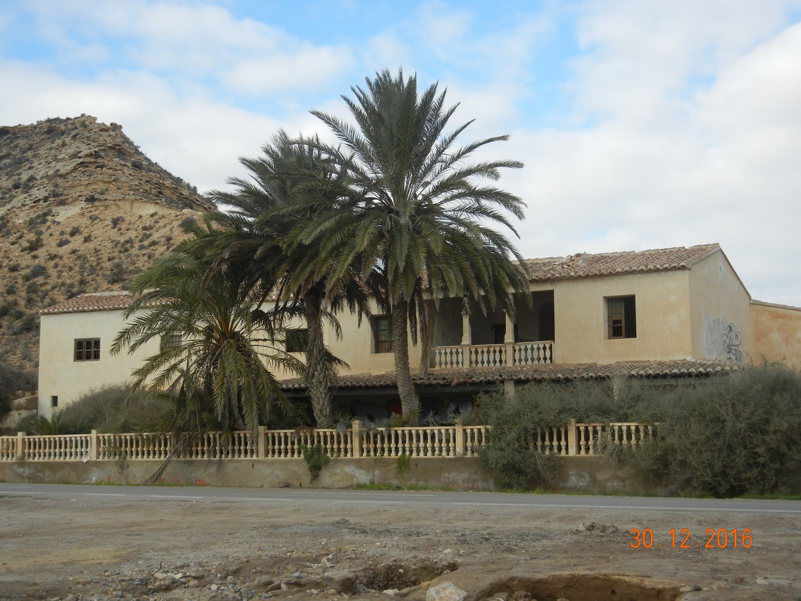 Playa del Taray tapizada de piedra en algunos tramos con lo que parece arena fosilizada, montoncitos petrificados del fondo del mar. Destaca junto a la carretera lo que parece una casona vacacional de otro tiempo, el cortijo del Taray, también conocido como La Casa de los Ingleses, junto a la desembocadura de una rambla poblada de árboles y arbustos, encharcada de lagunas por las recientes y copiosas lluvias. Es una mansión colonial, un palacete de llamativa arquitectura construido sobre un inmenso aljibe existente por unos empresarios ingleses a principios del siglo XX, durante la explotación de las minas del Pilar de Jaravía.