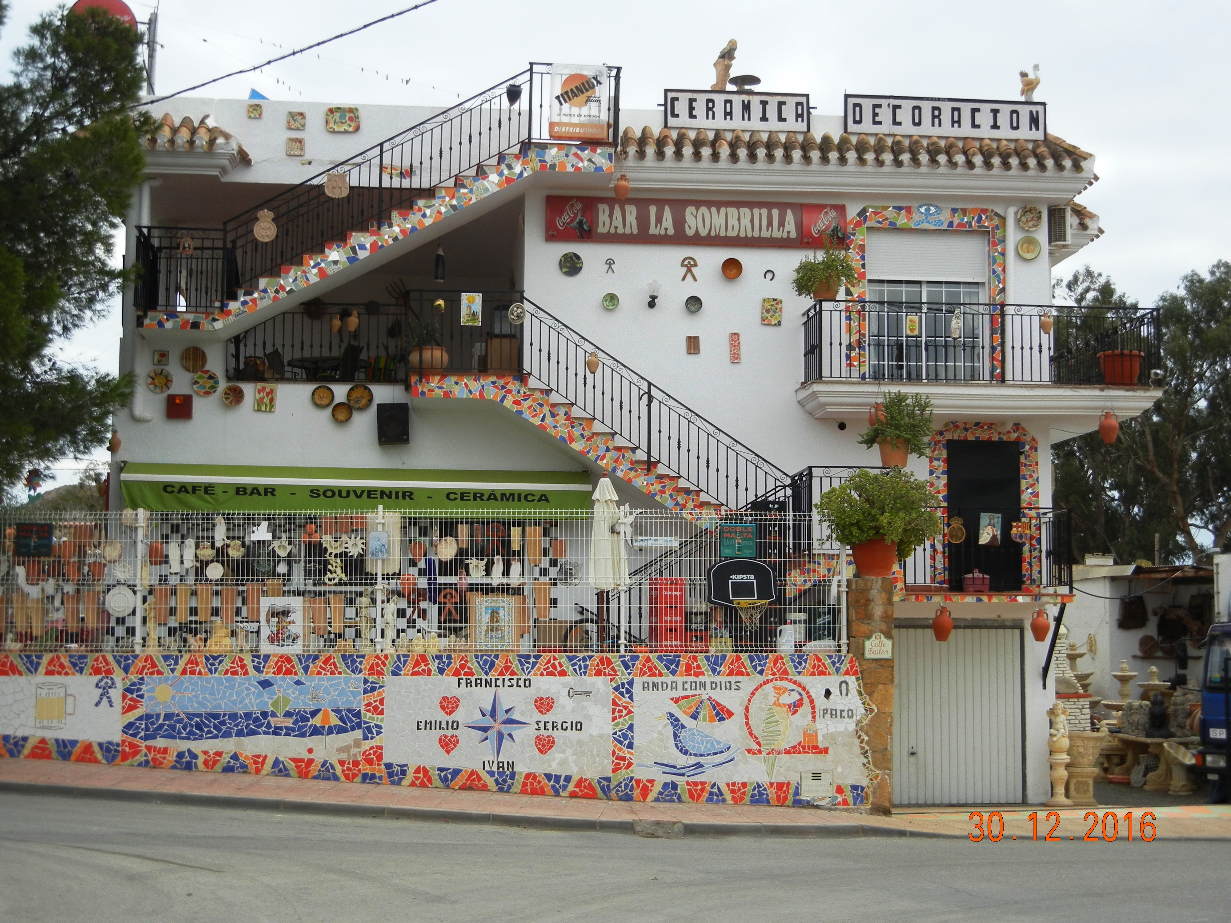 A trechos aparecen tramos de moqueta amarilla, arena compactada, rocosa, que permiten andar descalzo, se escalonan como un pedestal elevado sobre el oleaje. Prosigue el litoral en accidentes de sonoros nombres que evocan gestas pasadas que desconozco: cala del Invencible, cala La Italiana, dobla el terreno hacia levante en el morro en la Punta del Cañón, parece haber disparado, enfrente a una media milla marina, la Isla de Terreros. Un poco más adelante no puedo proseguir costeando. He de recular, salir a la carretera y llegarme hasta una rotonda donde destaca el taller de cerámica-café-bar-tienda de suvenir La Sombrilla, de peculiar apariencia decorado a base de mosaicos, para acceder por la calle Bailén y la calle Linares hasta la subida al castillo. Es necesario subir una empinada cuesta asfaltada, se puede acceder en coche también, para llegar a ese privilegiado otero.