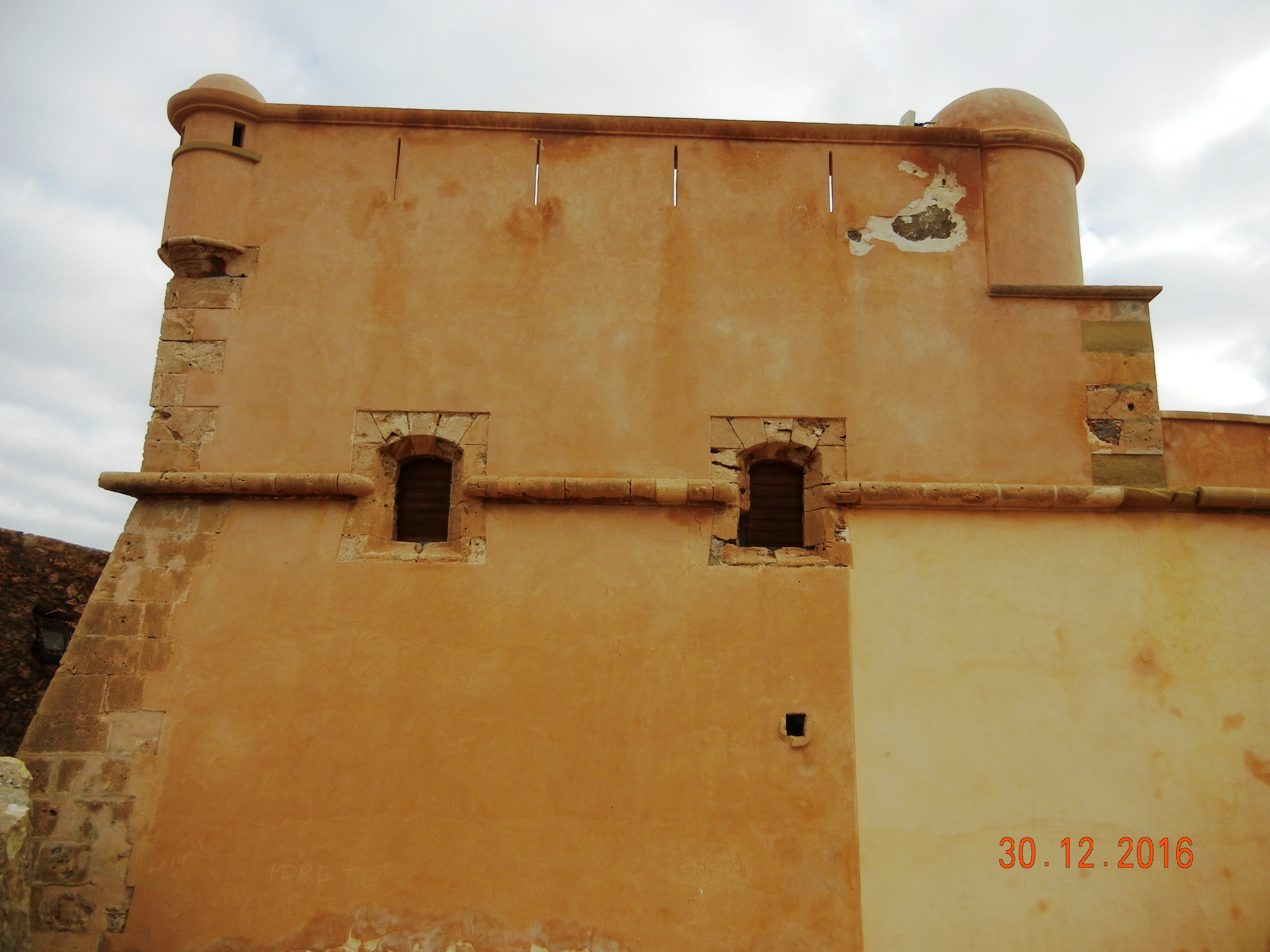 Aquella torre dio paso al castillo-batería edificado en 1764, reinando Carlos III, como reza una inscripción sobre su portada, es decir, después del de Águilas. A pesar de que el equívoco rótulo del horario indica está abierto a esta hora, no es así, alberga el Centro de Interpretación del Litoral Andaluz, y tengo que contentarme con verlo desde fuera. Puedo constatar que se encuentra en muy buen estado, aunque el revoque de cemento rosado tenga grandes desconchones, que posee foso y puerta levadiza, muros en talud con múltiples aspilleras y garitones en las esquinas. Es una pena no poder acceder a su patio de armas, tiene dos niveles y arcada en el segundo piso, aljibe, etc. He de contentarme con fotos. Tampoco puedo asistir en una sala del castillo a la proyección del audiovisual sobre una geoda gigante de 8 m de larga, la segunda más grande del mundo; es un hueco en una gran roca realmente, ubicada en el interior de una mina de hierro y plomo en el Pilar de Jaravía, con cristales de yeso transparentes de hasta 2 m., en la que caben hasta diez personas.