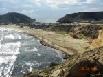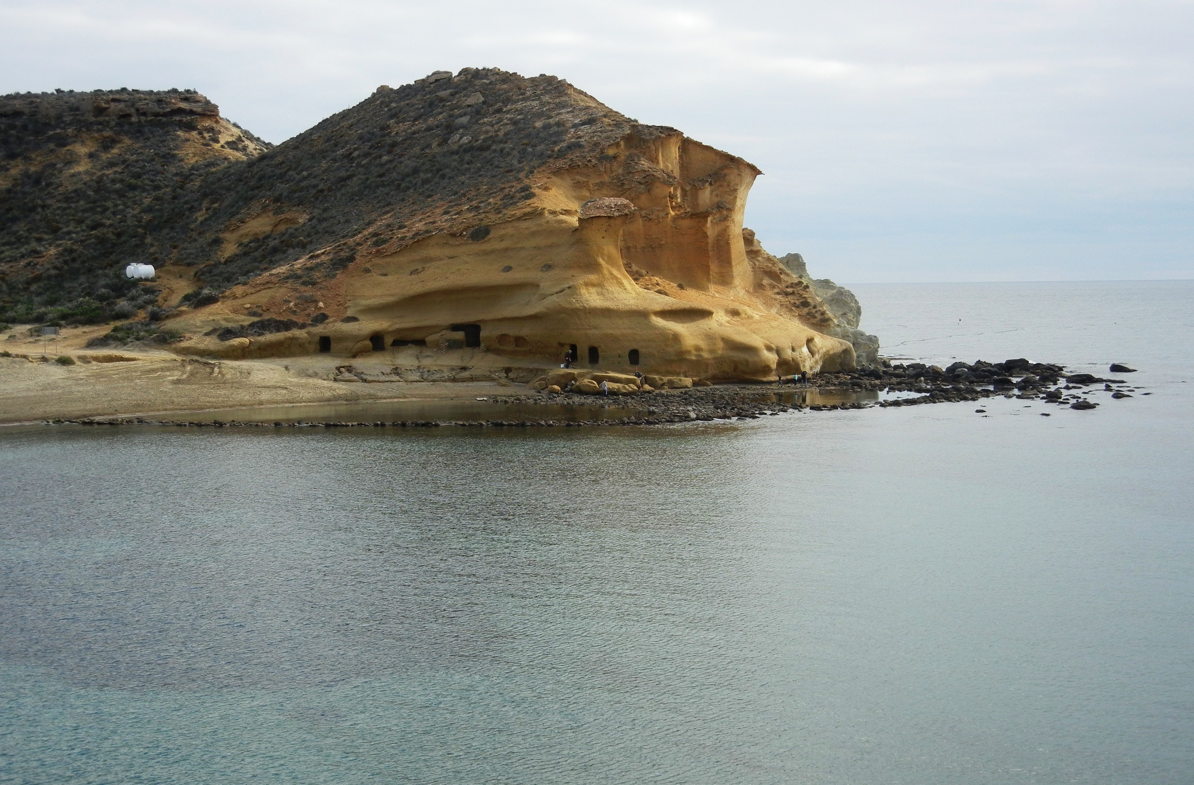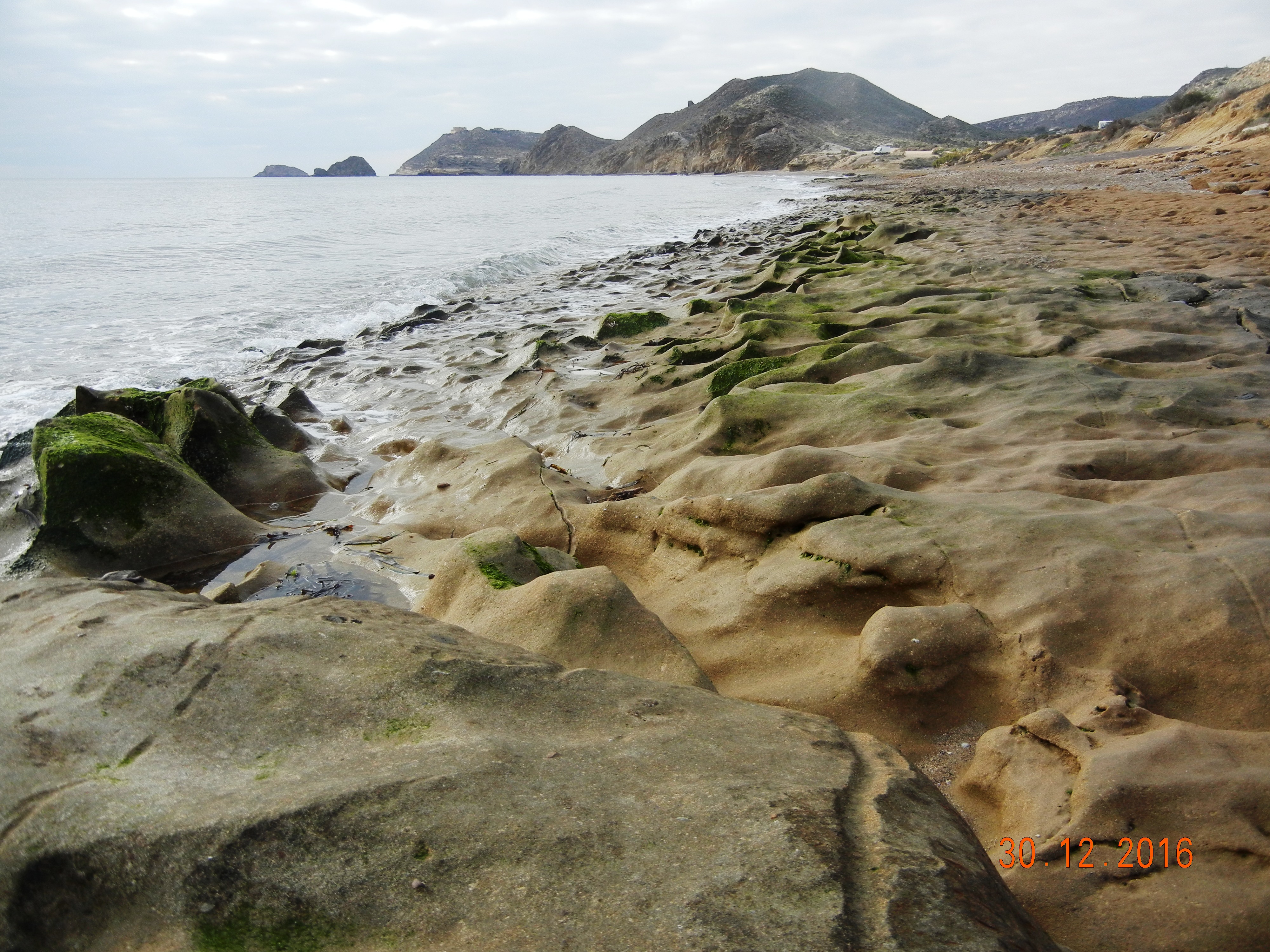 Era de suponer que no madrugaría, a consecuencia de la sesión de degustación cervecera de anoche, aunque tampoco resultó tan contundente como se podría imaginar en un primer momento. Añádase a ello que la etapa de hoy -por necesidades logísticas- es más bien corta, apenas la mitad de lo habitual, me propongo finalizar en Águilas. Desayuno y encargo un bocadillo que servirá para reponer fuerzas a media mañana. Antes de partir salgo a dar una vuelta por los alrededores, quiero investigar la multitud de calas y entalladuras que forman los riscos y morros prominentes en estos cerros de las últimas unidades de la Sierra del Aguilón, que dan lugar al enclave de San Juan de los Terreros Blancos (de nombre siempre más extenso que su poblamiento, hasta hace bien poco). En dirección a poniente, hacia la bahía, mirando lo andado, destaca en primer término el peñasco del Pichirichi, de unas decenas de metros, que actúa como un pequeño promontorio contra la monotonía del arenal playero y provoca que se forme un pequeño y peculiar tómbolo arenoso.