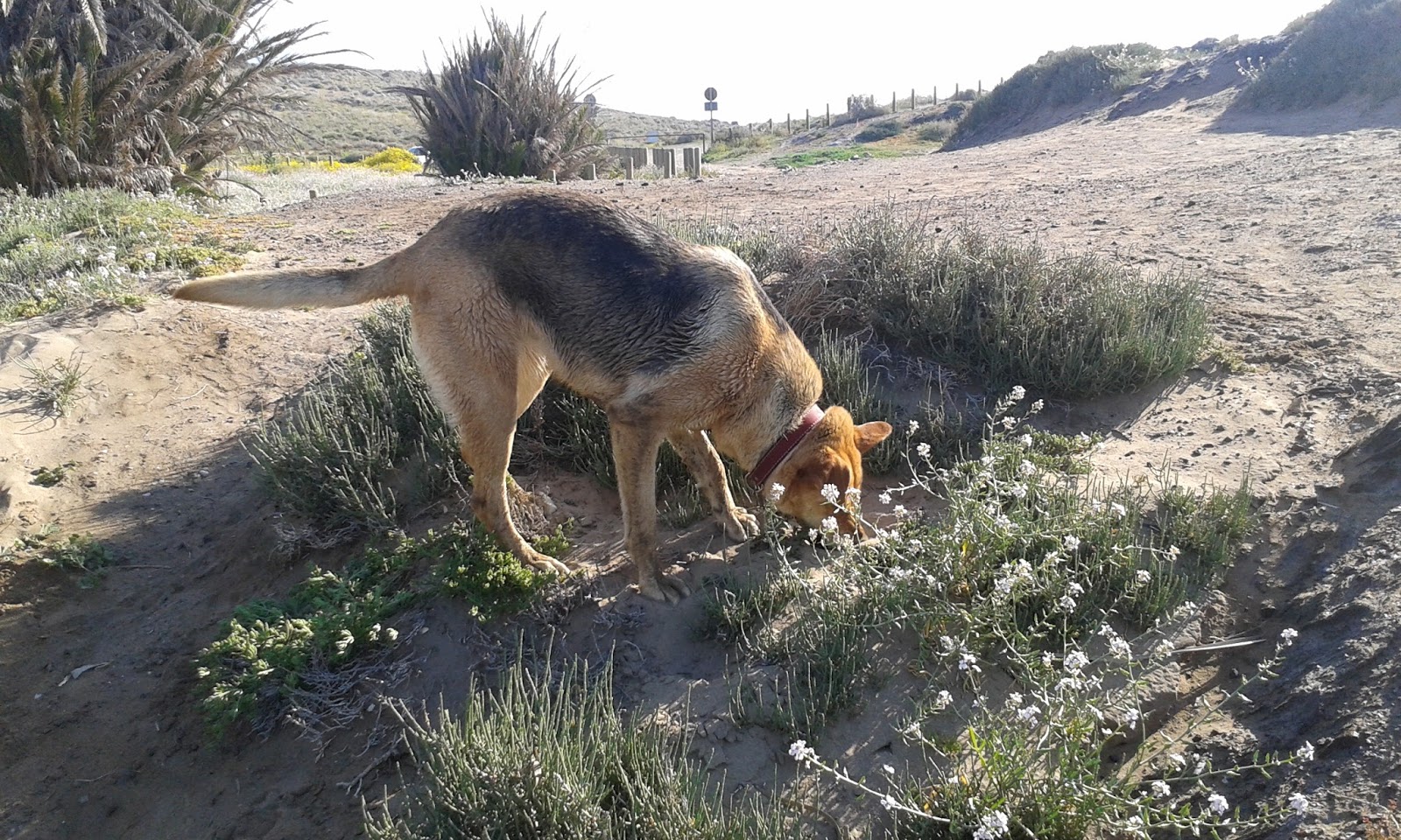 Me siento sobre la silla de una terraza del chiringuito, cerrado a estas tempranas horas, a disfrutar de la vista. Intento descifrar las extrañas grafías, a base de tenedores, que imprimen las gaviotas con sus patas sobre la arena húmeda. Recorre la orilla con paso inseguro una figura oronda, tocada de un gran sombrero agrícola de paja, vencido hacia adelante, apoyado en dos bastones; va precedida por un perro que lo husmea todo. Sospecho que es Miguel, el loco de Percheles, con el que he coincidido en otras ocasiones. Voy a su encuentro, ha parado en un extremo de la playa y está realizando una especie de ejercicios gimnásticos que apenas lo mueven, quieren parecer asanas de yoga, un intento de saludo al sol. Se me acerca Francis, la perra, al olisquearme me reconoce, no así su dueño. Comienzo a hablarle y ya me ubica, de otras andadas, tiene la cara hecha un mapa, me cuenta que le han operado de un carcinoma. Se le ve desmejorado, también ha engordado mucho. Charlamos un rato, le hablo de mi aventura costera y le dejo disfrutando de la playa, su playa, su particular paraíso, solitaria a estas horas, como prácticamente todas las mañanas del año, mientras Francis, que ha atrapado una lagartija, juguetea con ella.