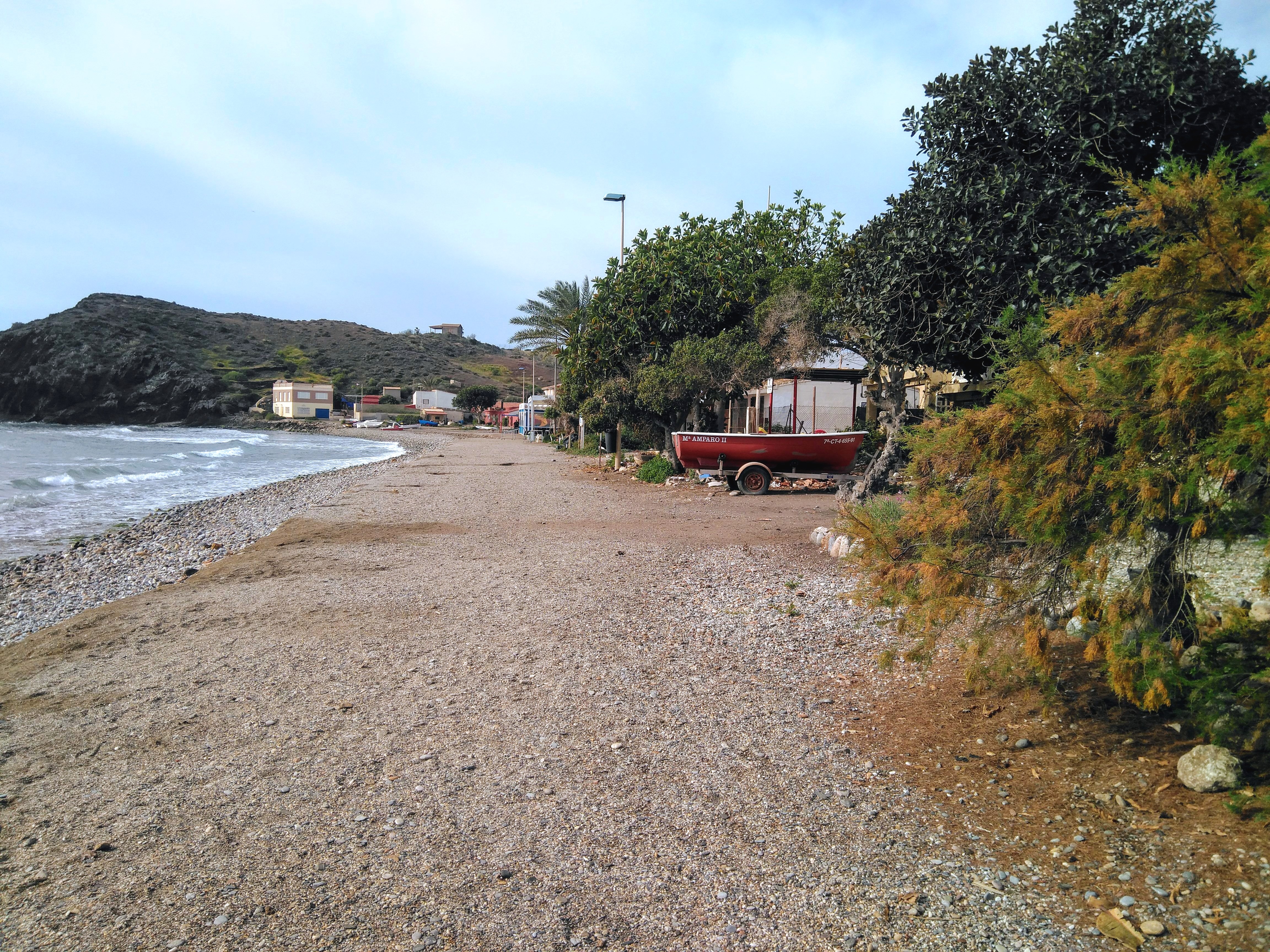 Tras las últimas edificaciones del puerto de Mazarrón, playa de Rihuete, desagua la rambla de El Alamillo ocasionando la playa del mismo nombre. Se abren, frente a mí, kilómetros y kilómetros de mar hasta la punta de La Azohía, al fondo del arco que describe la costa, se distingue perfectamente su torre hexagonal, de Santa Elena, parece poder tocarse con solo estirar el brazo.