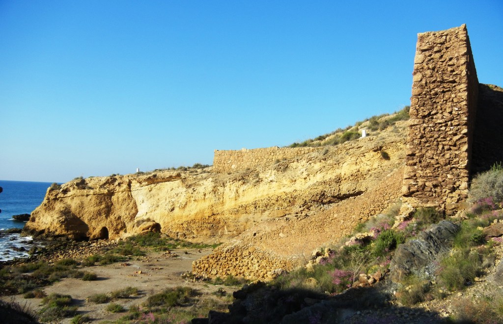 He de comenzar la crónica de esta etapa de la misma manera que lo hice ne la anterior, haciendo referencia a su riqueza minera y a los muchos vestigios que voy hallando relacionados con ello. Una vez recorrida la playa de Parazuelos, tras dejar atrás las casicas de Los Cloques (un cloque es un palo para enganchar los atunes de la almadraba) y la Casa Azul, residencia de la actriz murciana Margarita Lozano, en el mismo final de la playa, junto a unos bolos de piedra, recuerdo haber visto, casi enterrados por la arena, unos raíles oxidados que después arrancarían para vender como chatarra. El resurgir minero de la zona se dio en el XIX a consecuencia de las Guerras Carlistas, que obstaculizaron la extracción del hierro en Vizcaya, los empresarios mineros tuvieron que aprovisionarse en el sudeste español donde se hallaron nuevos filones. Desde 1874 se comenzó a extraer un mineral de excelente calidad, la compañía The Morata Railway en 1888 construyó los 15 km. de vía férrea que comunicaban la mina La Positiva, de ese pueblo, con la cala del Muerto donde se embarcaba en vapores.