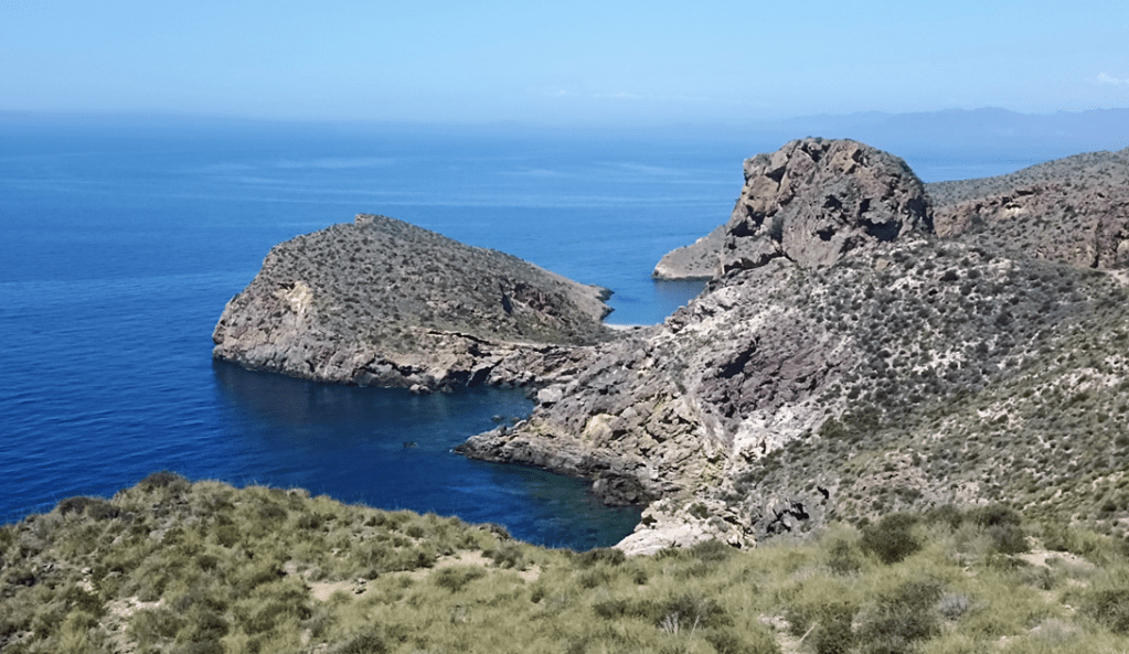 Sé que este cabo-sierra que piso despunta en siete cocones, siete. Y un desasosiego de elevaciones menores revueltas, como rebaño en estampida, lo terminan de cubrir casi por completo, excepto un llano que ocupa la aldea del Campillo de Dentro. Crestean cual espinas de mastodonte las siete vertebras recortándose poderosas en el azul. Desde cualquier punto del arco de la Bahía de Mazarrón, que se abre a continuación, se pueden distinguir sus siluetas.
