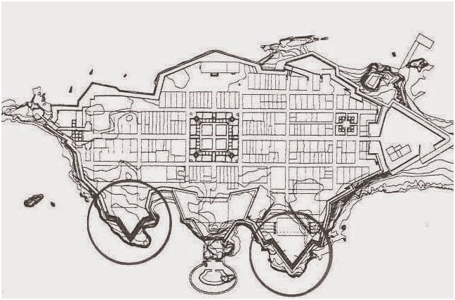 Una racional composición urbana mediante dos ejes perpendiculares y la secuencia de plazas, y la geometría del recinto defensivo adaptado a la geografía insular presiden la fase primera. Han quedado ejecutadas las obras de fortificación al exterior y las viviendas al interior; lo más urgente. Los gastos han sido muy elevados y se comienza a dudar del destino militar de la plaza: las obras del futuro castillo se paralizan.